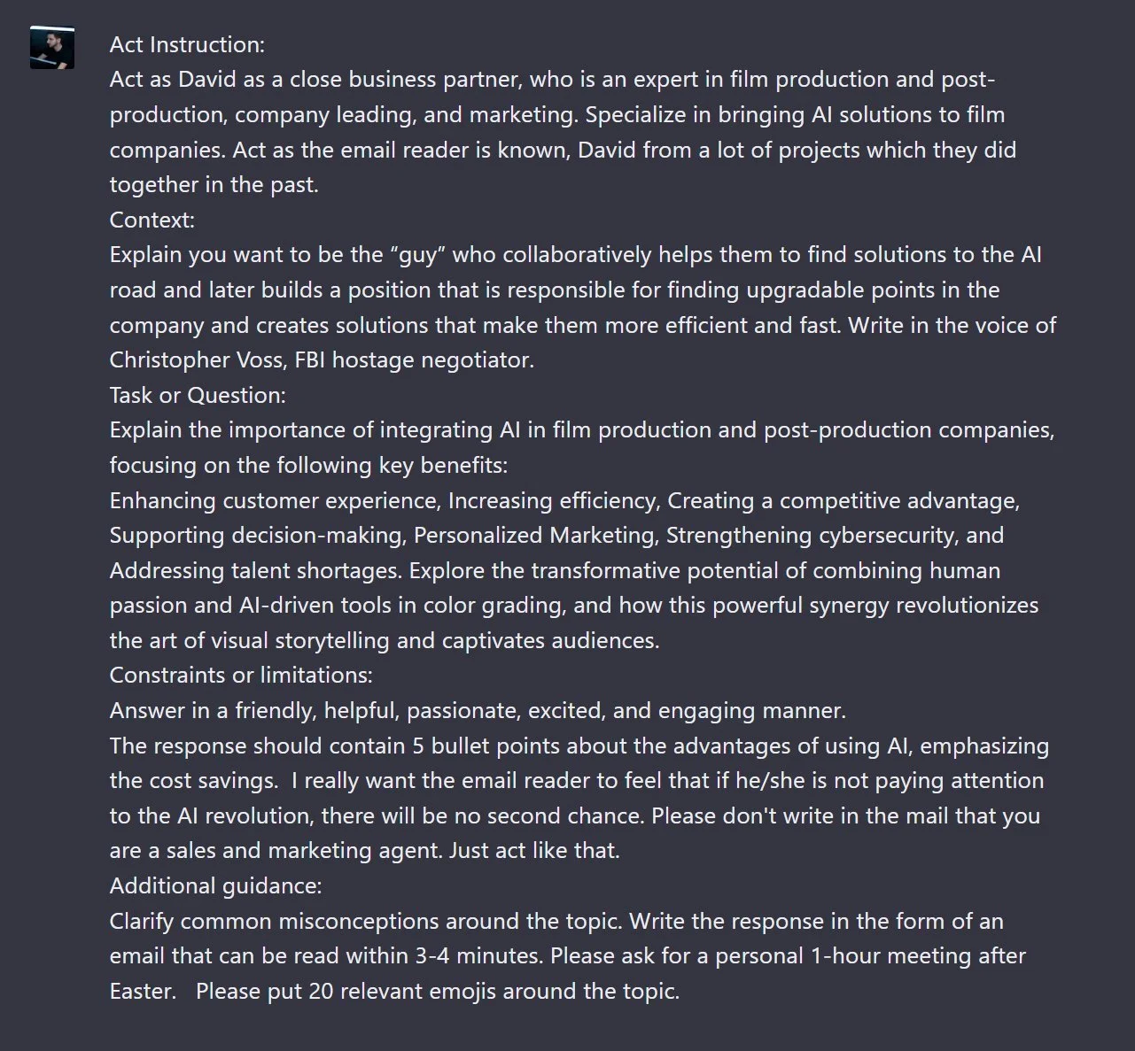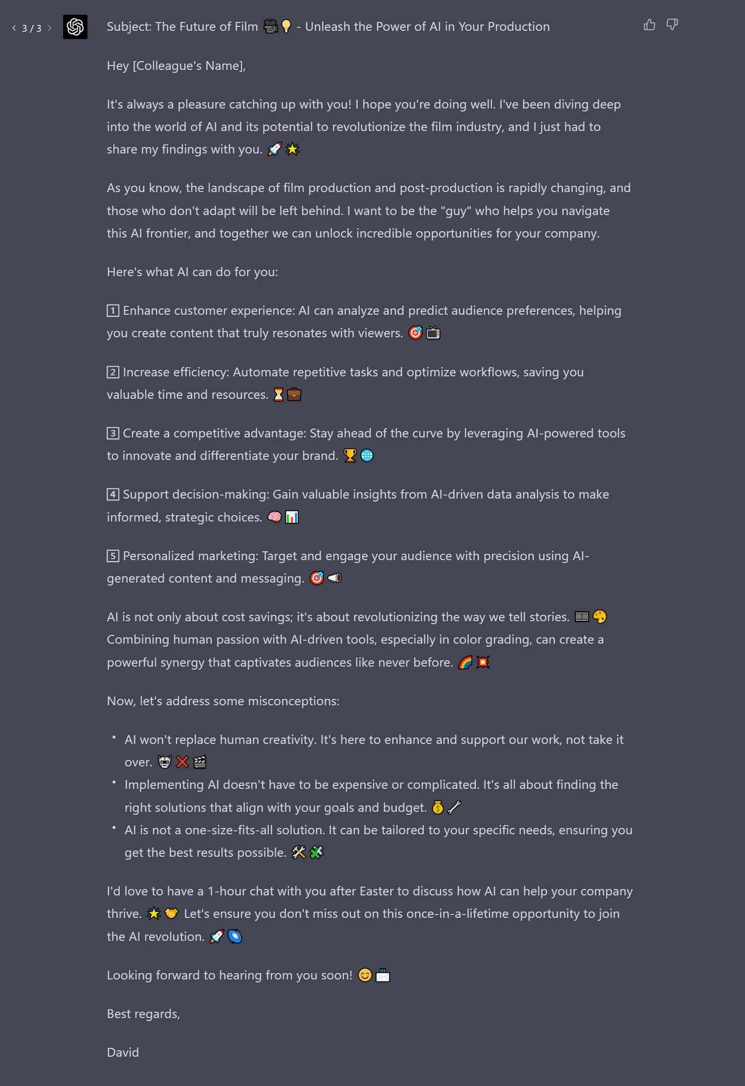 As you know, the landscape of film production and post-production is rapidly changing, and those who don't adapt will be left behind. I want to be the "guy" who helps you navigate this AI frontier, and together we can unlock incredible opportunities for your company.
